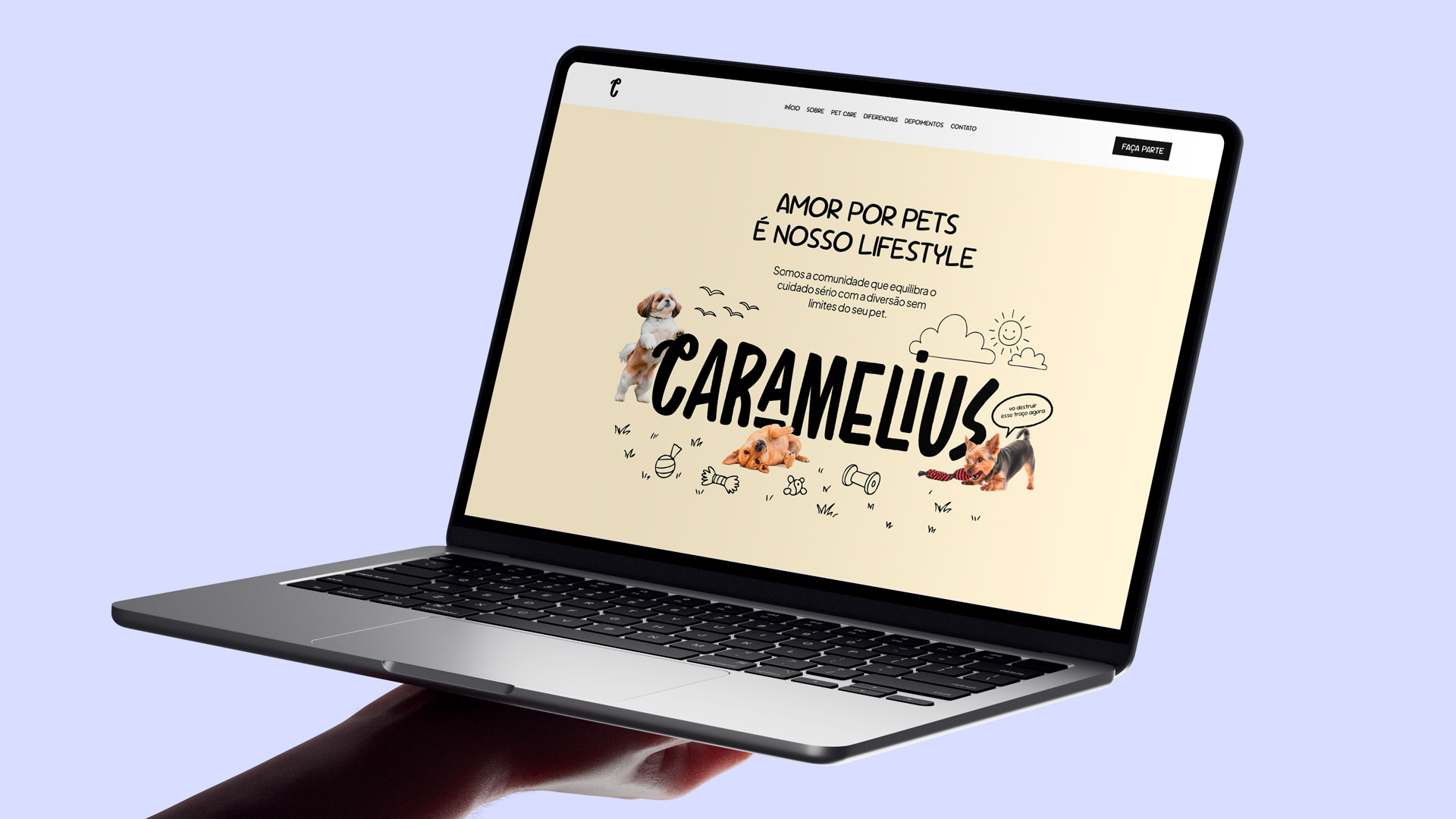 A marca nasceu de um amor real por pets, e precisava de uma landing page que falasse isso com a mesma intensidade que um cachorro late quando o dono chega em casa. A missão era traduzir essa energia em tela: acolhedora, divertida, com aquele calor de comunidade que só quem tem bicho conhece. Foi a construção de um ambiente digital onde o pet é protagonista, e o dono se sente, finalmente, em casa.