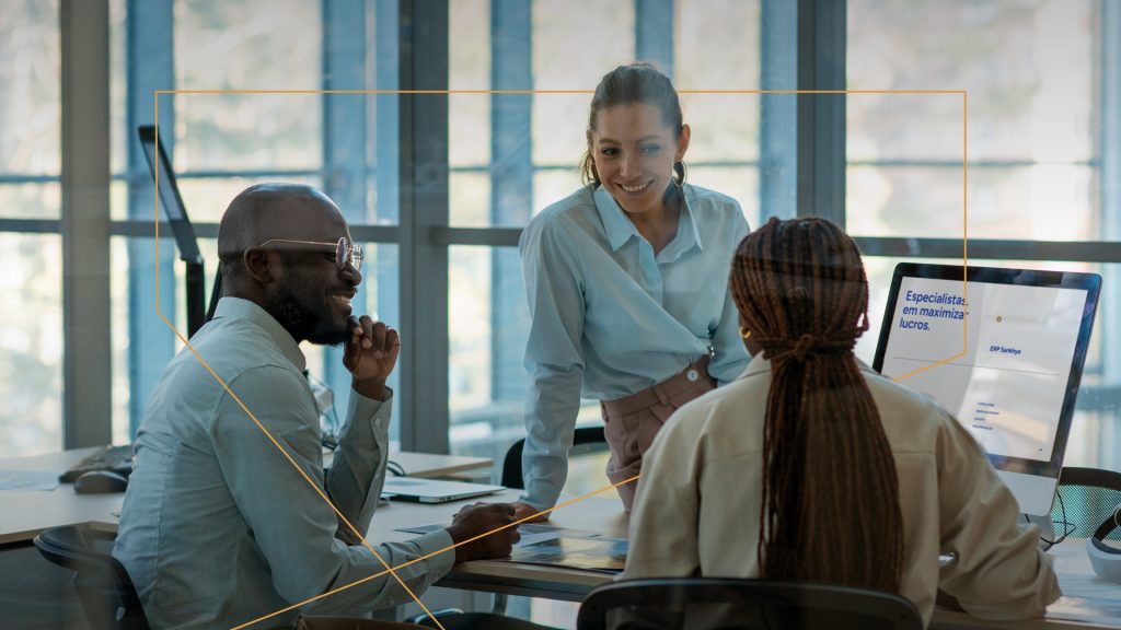 Os grafismos diagonais derivam do próprio logotipo e funcionam como um sistema visual modular, que remete à ideia de fluxo contínuo de dados e integração entre sistemas, um dos pilares do universo ERP. Suas interseções e sobreposições criam uma sensação de profundidade e movimento, conferindo dinamismo às aplicações sem comprometer a clareza.