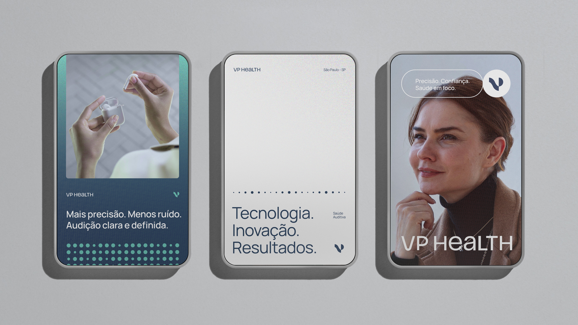 A VP Health é uma marca focada em soluções tecnológicas para diagnósticos auditivos, especialmente voltada ao tratamento de zumbido. A proposta visual traduz exatamente isso: uma marca que une ciência e sensibilidade, sem parecer fria ou distante.
